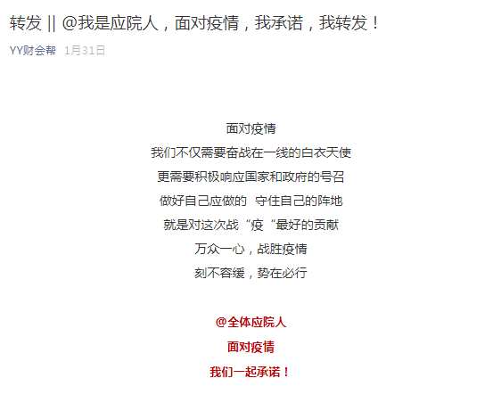 当前,新型冠状病毒感染肺炎疫情的防控进入关键期,yl88858永利中国党总支在线开展了我是应院人,面对疫情,我承诺,我转发!——主题党日活动。—声援祝福说出来、践行承诺动起来,以庄严承诺积极应对疫情,以实际行动接受党性洗礼。