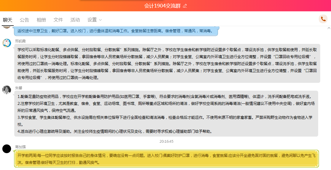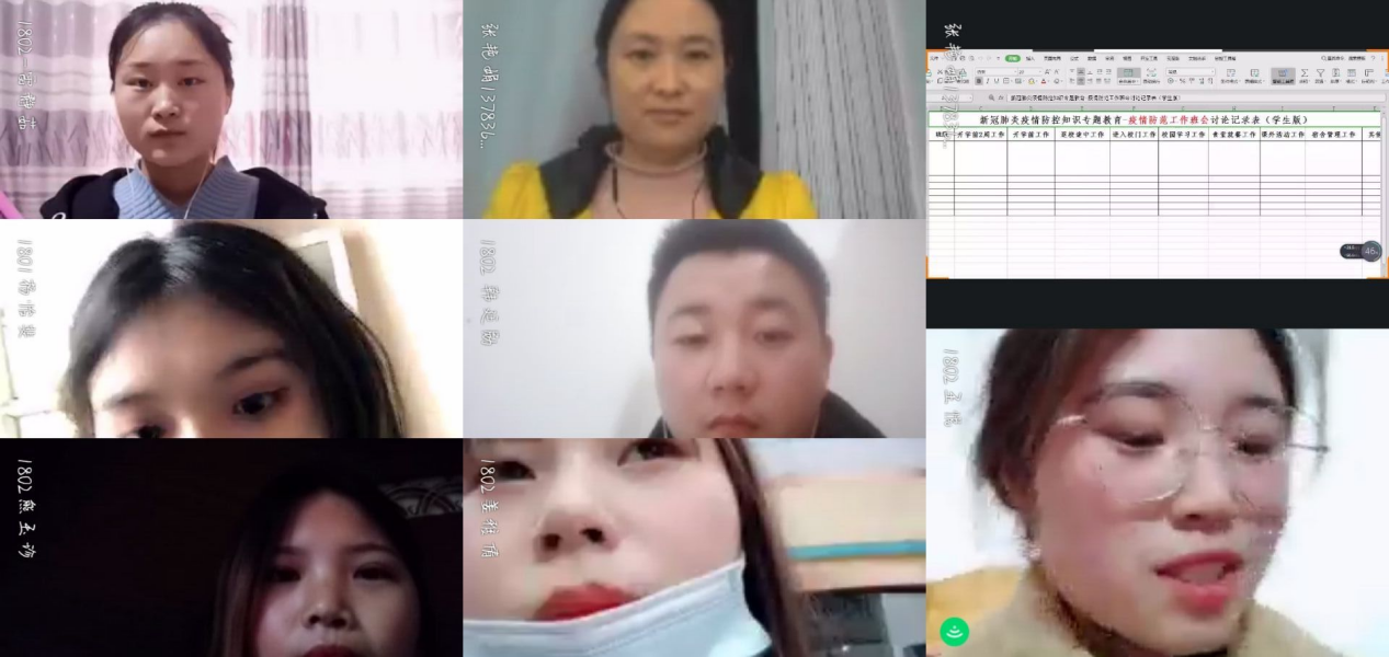学生们则是在团总支安排下以班级团支部为单位由辅导员带领开展主题团日活动。通过观看学习视频,学生们了解到病毒的传播与感染和每个人的生命安全都息息相关。作为大学生来说,目前为抗击疫情能做的是提升科学素养和基础防疫知识水平,并养成戴口罩、勤洗手、不吐痰等良好习惯。这不仅是对个人健康负责,更是减少疫情传播途径。同时对于疫情消息,我们要做的是提高警惕,但切莫恐慌,更不要随意传播虚假信息,造成社会舆论。视频学习后,全体学生以团支部为单位从新冠肺炎本身及防控原则与使用、学校相关人员职责、开学前2周、开学前、返校途中,进入校门,校园学习、食堂就餐,体育活动、宿舍卫生消毒等方面组织进行讨论。经过探讨,形成相关书面建议,为校园疫情防控工作开展打下了扎实的基础。