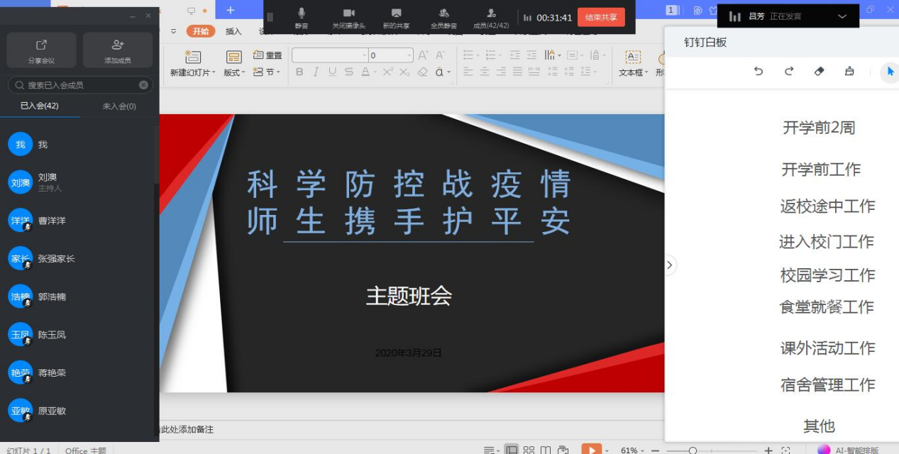 教师们在院长张召哲的带领下观看学习李海斌老师的“疫情防控科普知识”讲座视频,并认真思考,针对学校开学前、开学中、开学后及教学、就餐等方面发表了自己的观点。在讨论会上,大家热烈的讨论,都认为对于教师与学生在开学前期要做好个人的防护措施,及时进行健康填报并及时汇报自身情况。在开学后要做好个人防护工作,进行体温检测、在多人办公场所应佩戴口罩,对办公场所应做清洁、消毒、通风,最好是自带餐具,实行分餐制,有效避免人员聚集。对于视频的学习,主要是提高师生的防控意识、提高重视程度,从内因上管理自身,提高安全意识。