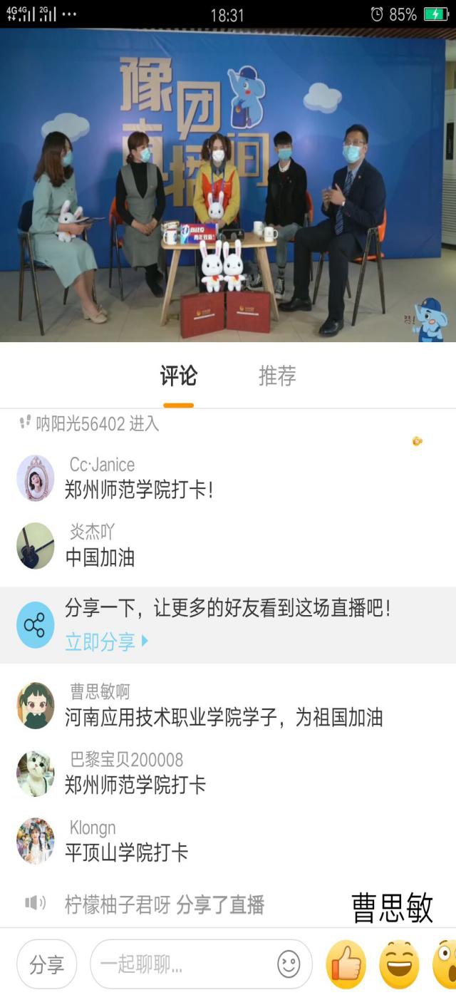 2020年4月9日下午,yl88858永利中国团总支在校团委的统一部署下,由团总支书记聂蕴老师组织全体学生干部走进豫团直播间,观看“90后的青春答卷”直播活动,聆听抗“疫”故事,重温抗“疫”时刻。yl88858永利中国团总支将此次学习作为一次生动的主题团日教育活动,鼓励全体学生干部磨砺意志、艰苦奋斗,勇做新时代有为青年。