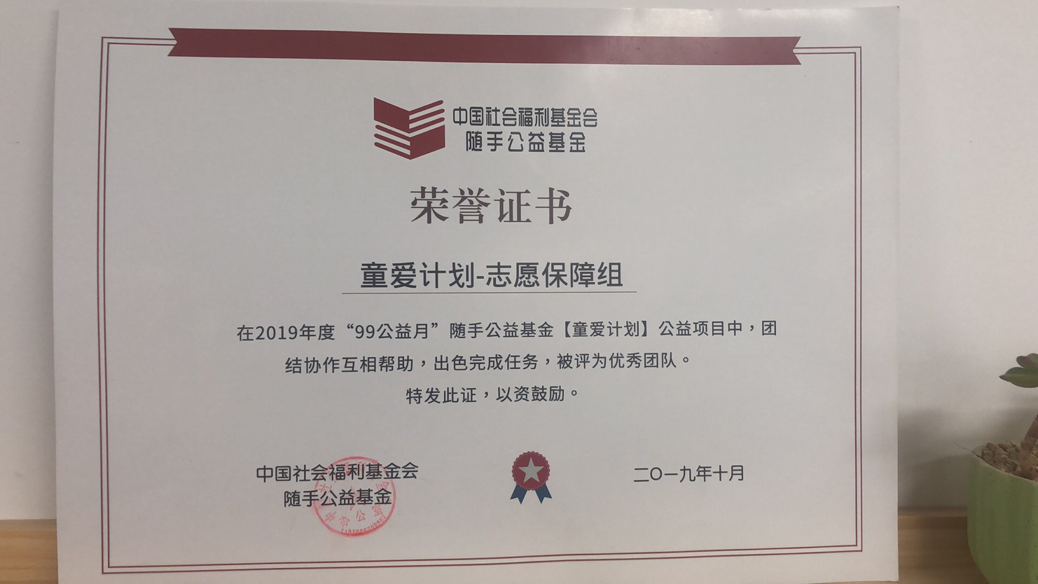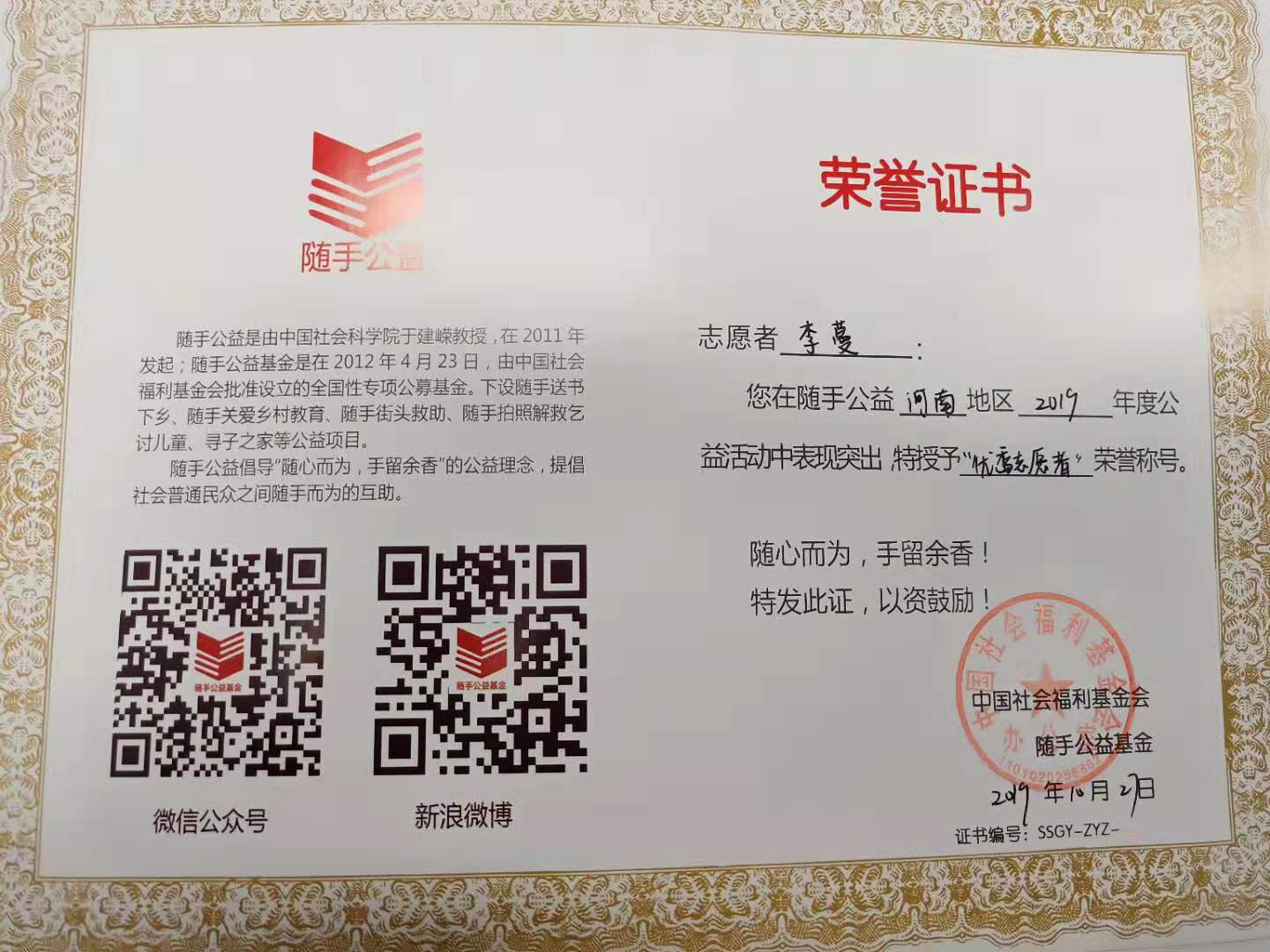 2019年10月27日,由中国福利基金会“随手公益”基金组织举办的“99童爱计划”颁奖典礼在郑州市千玺广场大厦举办,yl88858永利中国党总支学生党支部志愿服务团队应邀参加颁奖典礼。