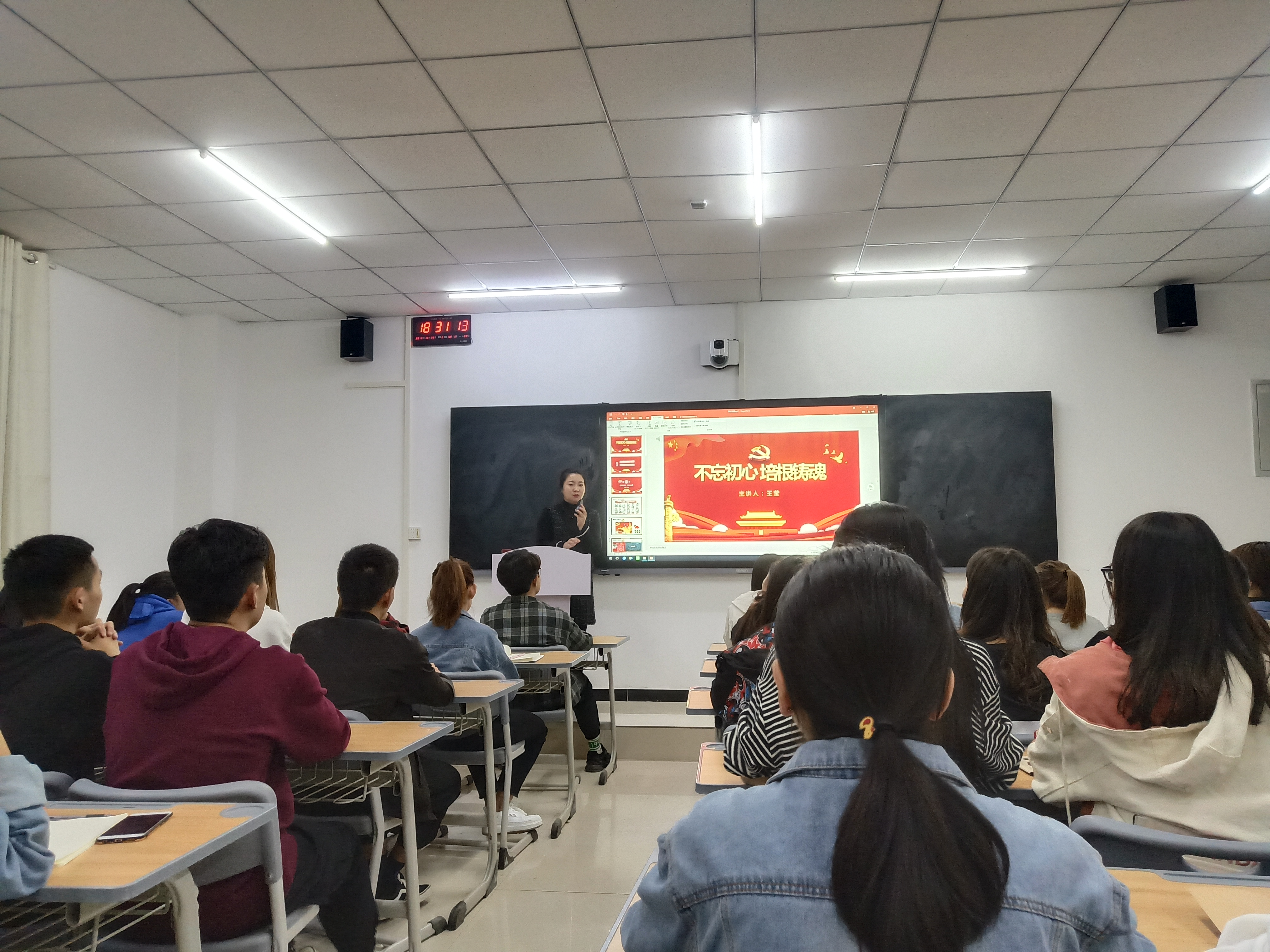2019年10月29日晚,yl88858永利中国党总支学生党支部组织全体入党积极分子开展“不忘初心 培根铸魂”主题教育党课。此次党课由团委王莹老师主讲,组织委员聂蕴老师主持。