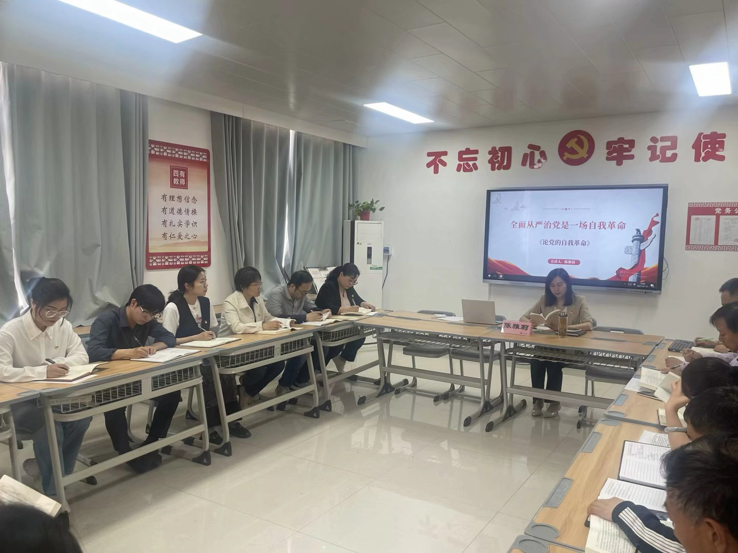 随后,陈雅莉就《全面从严治党是一场自我革命》一文展开深入领学。她先是从坚持思想建党和制度治党相统一、坚持使命引领和问题导向相统一、坚持抓“关键少数”和管“绝大多数”相统一、坚持行使权力和担当责任相统一、坚持严格管理和关心信任相统一、坚持党内监督和群众监督相统一等六个方面,带领大家逐字逐句读、原原本本学,落实“读原著”要求。接下来,陈雅莉围绕上述六个方面,深入分析了其蕴含的柔性和刚性、被动和主动、“两点”与“重点”、权利和义务、监督与信任、内部和外部几组逻辑关系,对党员们接下来的“悟原理”给予了引导和启发。之后,陈雅莉结合纪委的日常工作和年度重点工作,对上述六点再次深入分析、深研细剖,以由理论到实践、由一般到特殊、由抽象到具体的方法与手段,达到了“联系实际学”的良好效果。