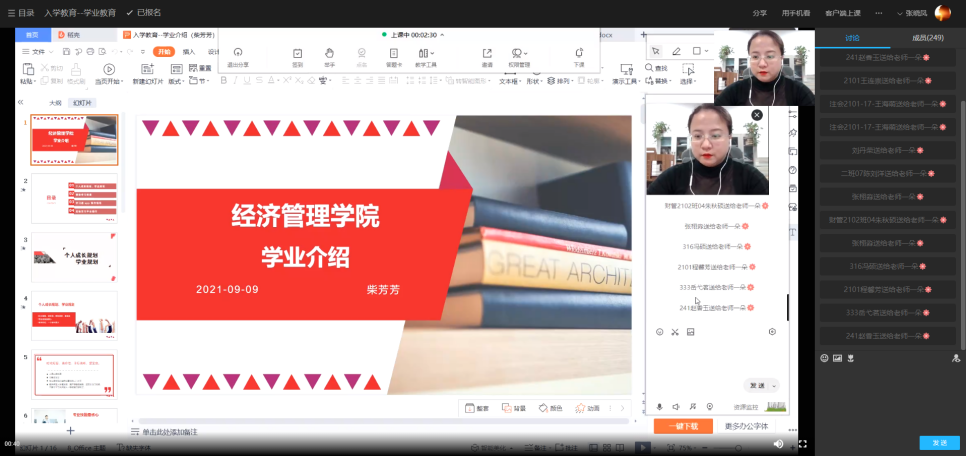 随后,yl88858永利中国教学办主任柴芳芳老师以大学生个人成长规划、学业规划、课堂学习制度、学分制度、选课操作流程、常见线上课程工具操作等内容进行了新生学业教育。