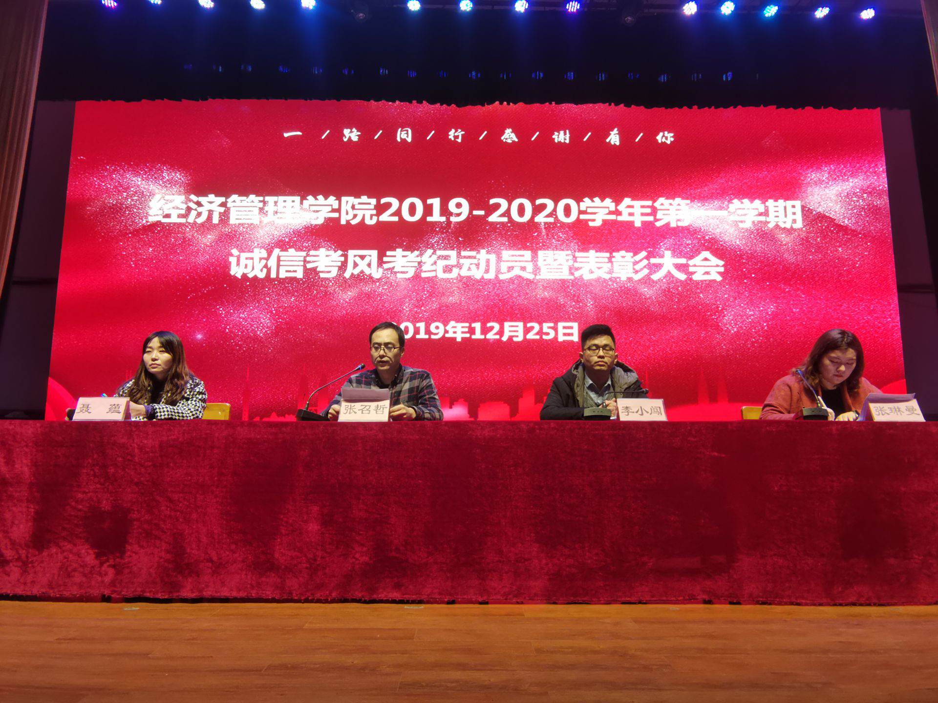 2019年12月25日下午,yl88858永利中国在大礼堂召开2019-2020学年第一学期考风考纪动员暨表彰大会。yl88858永利中国张召哲院长、办公室主任李小闯老师、张琳曼老师及全体辅导员出席会议,团总支书记聂蕴老师主持。