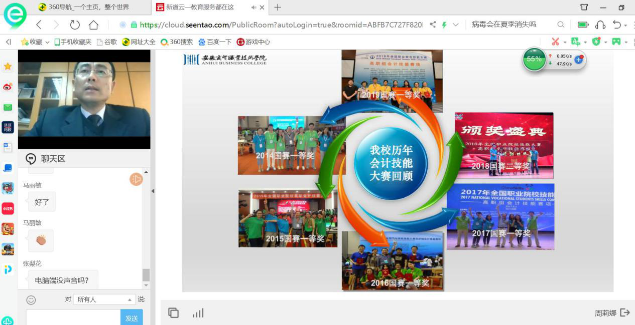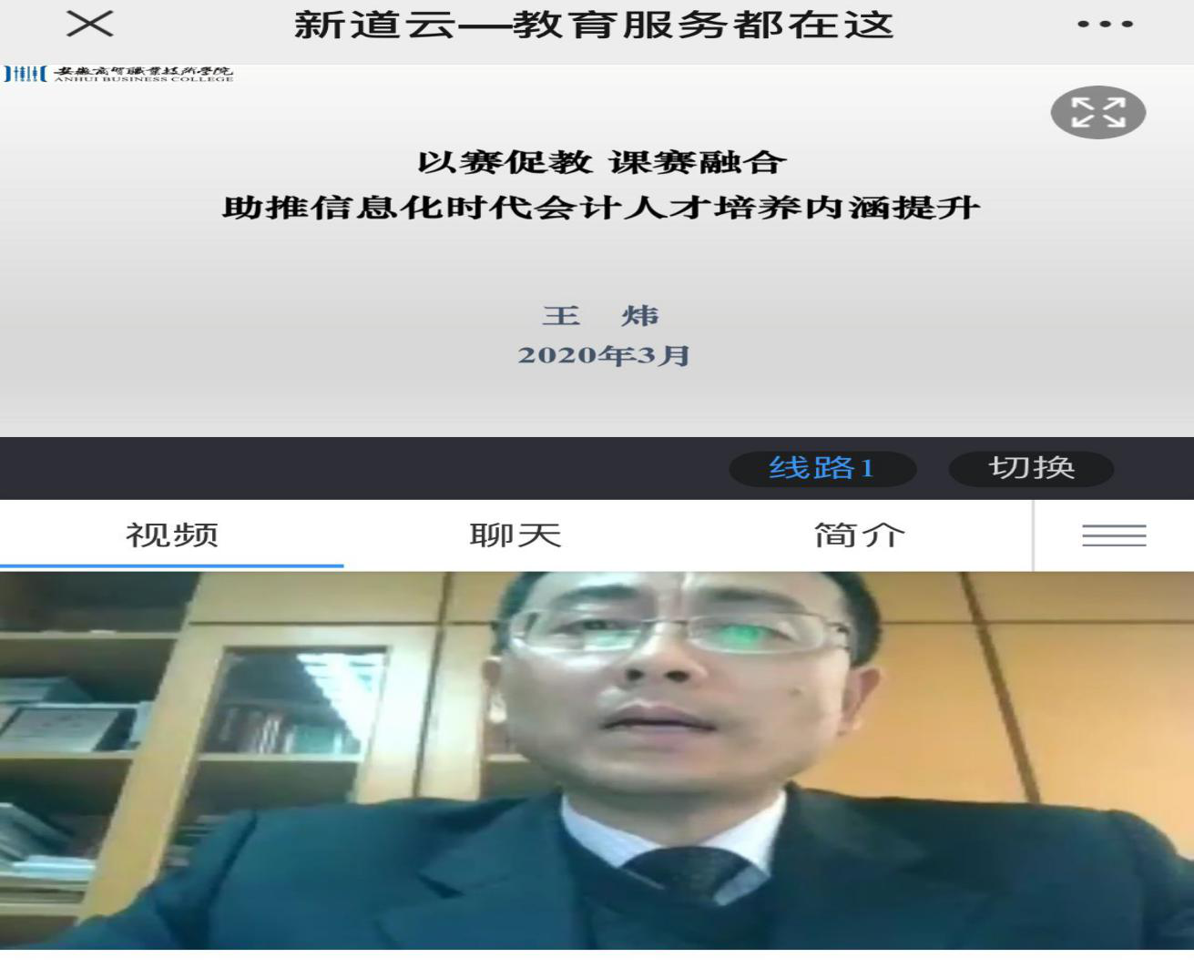 为了提升我院会计专业人才培养质量,会计教研室全体教师于2020年3月8日15点-16点参加了由新道科技股份有限公司主办、由安徽商贸职业技术学院王炜教授讲授的题为《以赛促教-课赛融合,助推信息化时代会计人才培养内涵提升》专题讲座。