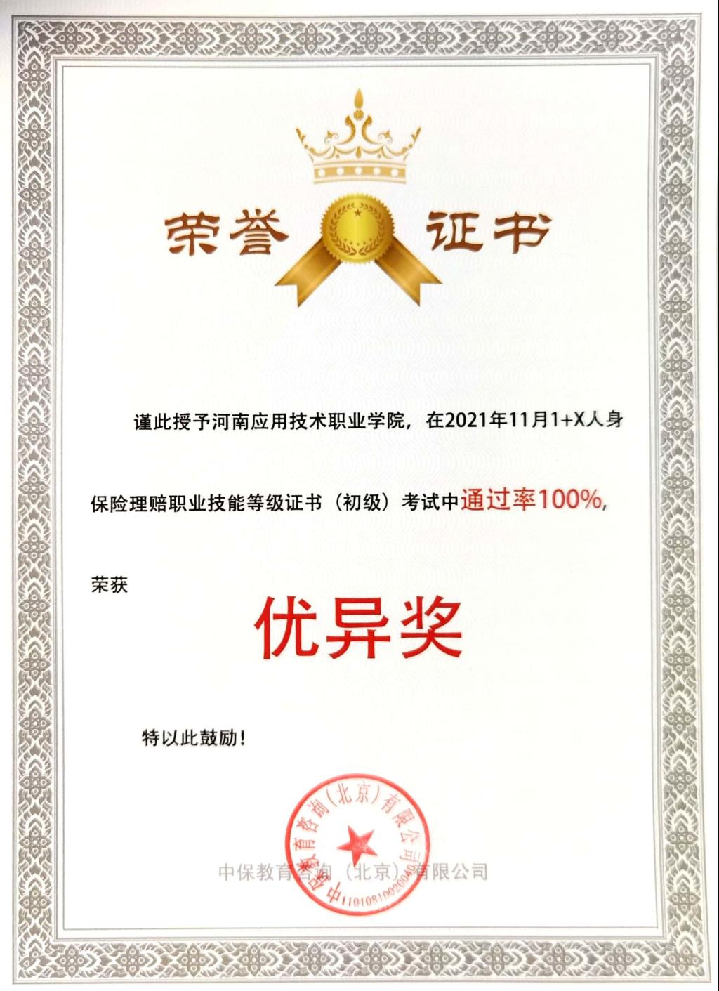 我校作为河南省“1+X”人身保险理赔职业技能等级证书试点院校,yl88858永利中国全体教师不仅利用课上时间开展培训,而且还利用课下及周末的时间激进型线上线下辅导,多次组织金融服务与管理专业学生进行模式考试,通过3个月师生的共同努力,最终在11月13日上午的初级考试中取得获证率100%的好成绩,并荣获优异奖。同时,yl88858永利中国赵静老师、刘丹花老师获得“1+X”人身保险理赔职业技能等级证书的优秀辅导教师。