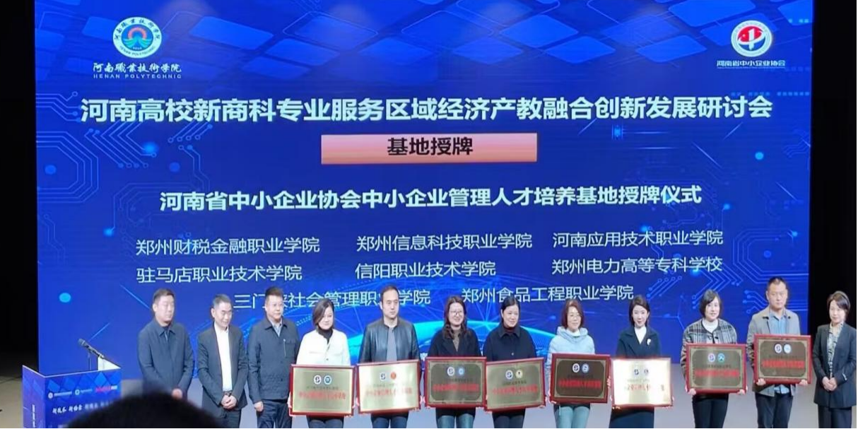 在本次会议上,“政行企校研”生态合作模式正式发布,河南省中小企业协会正式授予我院“河南省中小企业协会中小企业管理人才培养基地”称号。这不仅是对我院人才培养质量的肯定,也是对我院积极推进校企合作、产教融合工作的高度认可。