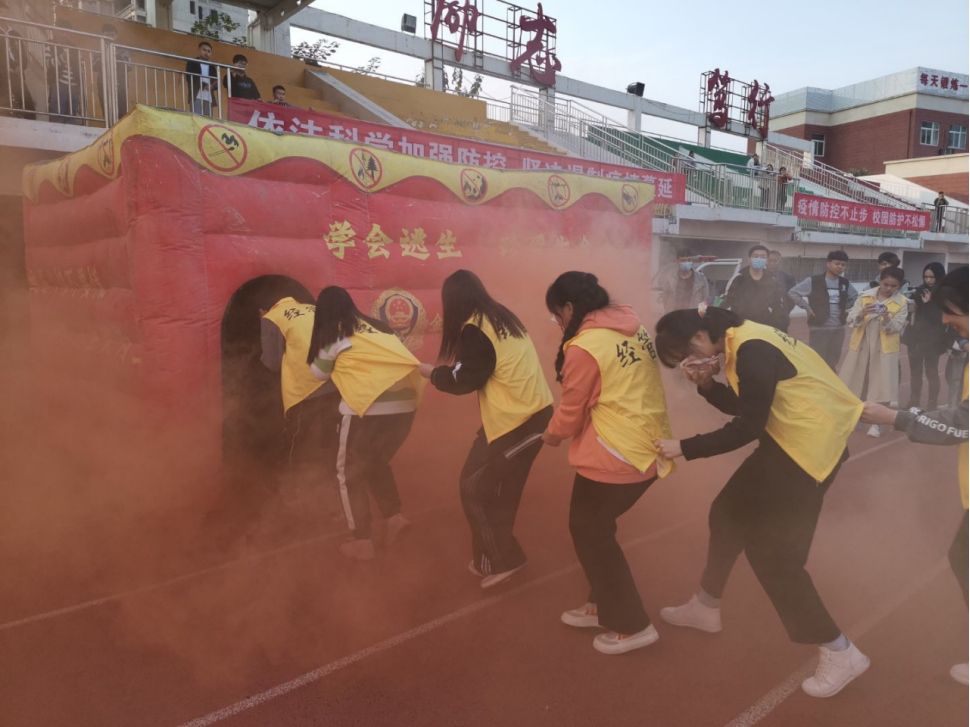 演练前,教员详细讲解进入逃生屋的注意事项,对消防安全隐患排查整治、应急处置等关键环节进行了着重强调,要求师生员工认真学习消防安全知识,掌握逃生疏散技能。随后六个人组成一队,待烟雾弹燃放后,演练总指挥下达“开始疏散”指令,在急促的哨声中,参与演练的学生在浓烟中用湿手帕捂住口鼻,在疏散工作人员的指导下,有条不紊地逐一亲自演练指定的项目,“身临其境”的掌握相关动作要领,结束后有序撤离到了预定的安全地带。最后,李警官以“提高消防意识,维护校园安全,从自身做起”为主要内容,举例近几年的校园火灾案例,向全校学生发出安全防范倡议,并得到了在场同学的积极响应。