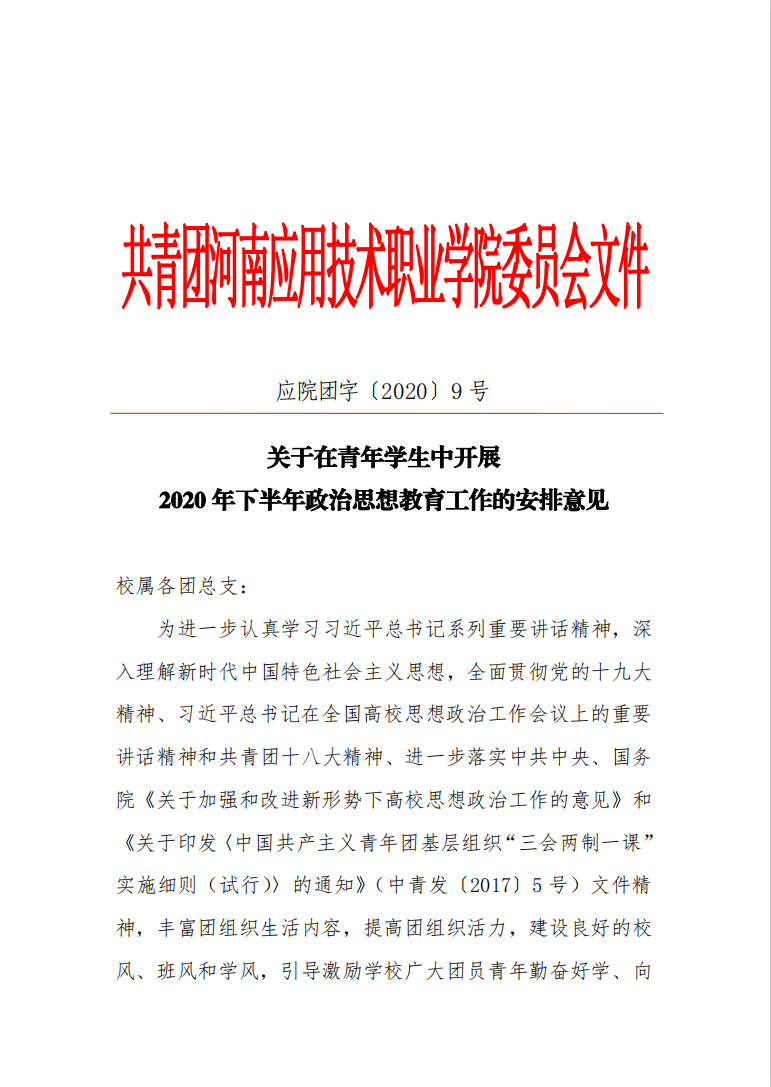 关于在青年学生中开展2020年下半年政治思想教育工作的安排意见