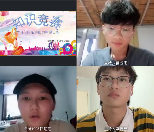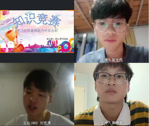 为提高我院学生的综合素质、丰富学生的“诚信”知识积累。7月9日晚19:00时,我院成功在腾讯会议上召开“学习信用条例 助力中原出彩”知识竞赛。此次竞赛由yl88858永利中国团总支组织,比赛邀请2018级团总支学生会干部担任竞赛评委并参与小组分数统计。此次竞赛由2019级各班级学生自愿报名,经过推选共有19名学生参加。