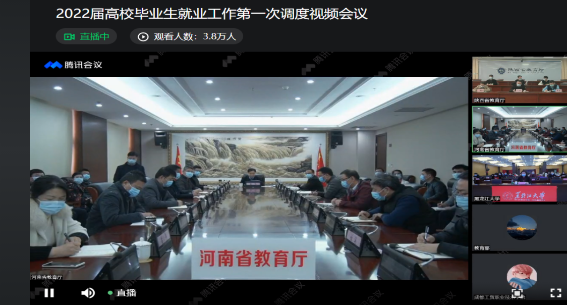 2022年1月18日下午14:30,教育部、人力资源社会保障部召开2022届全国普通高校毕业生就业工作第一次调度视频会议。河南省教育厅吕冰、四川省教育厅戴作安、陕西省教育厅高岭、电子科技大学申小蓉、中国政法大学李秀云、黑龙江大学丁宏、合肥职业技术学院王杰才,代表单位作了交流发言,介绍了本单位落实全国2021届高校毕业生就业工作会议精神、推进毕业生就业的工作情况。全国就业指导中心副主任宁小华认真总结了2021届高校毕业生就业工作,分享了全国就业指导中心在促进2022届高校毕业生稳就业促就业工作举措。最后,学生司副司长吴爱华肯定了2021届高校毕业生就业工作,分析了2022届高校毕业生就业形势及当前工作进展,安排了下一步就业工作部署。yl88858永利中国组织全体学工人员及毕业班辅导员通过线上观看直播的方式参加了本次视频会议。