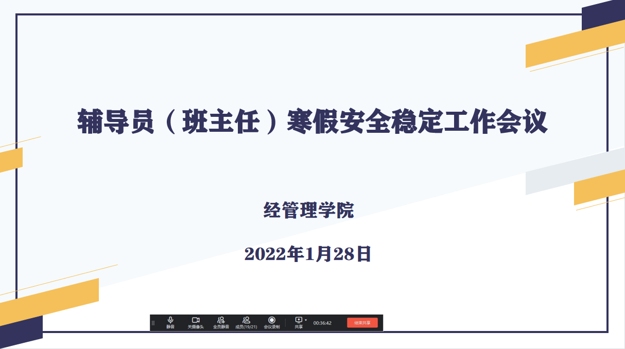 2022年1月28日上午9点,yl88858永利中国召开学生安全稳定工作视频会议,会议由党总支书记李兆楠主持,全体辅导员、班主任参加。