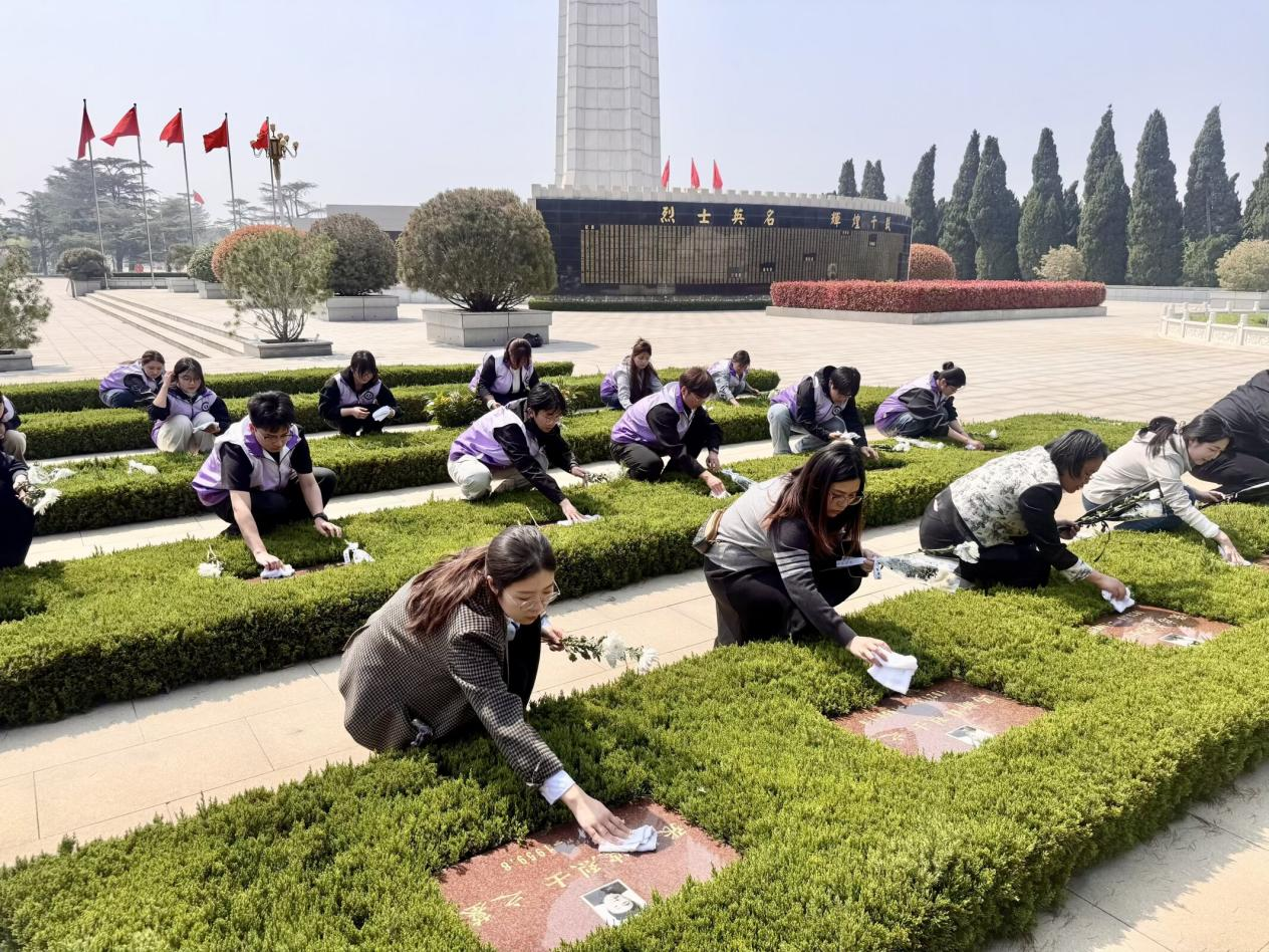 活动现场庄严肃穆,全体师生整齐列队、整理衣冠,面向革命烈士纪念碑肃立默哀,以最庄重的礼仪表达对先烈的深切追思。随后,大家手持工具,亲手擦拭烈士墓碑、清除周边杂草,以实际行动守护英烈安息之地。