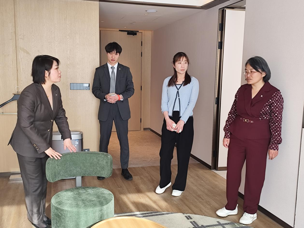 酒店人力资源总监韩文静热情接待并全程陪同,带领一行人先后参观酒店前台、客房、餐饮、会议室等核心区域。参观过程中,韩文静介绍道:“希尔顿逸林作为希尔顿集团在大陆的第1000家店铺,与希尔顿花园组成双子星建筑,形成双品牌联动,打造功能互补的酒店综合体。”她还特别就两家酒店的经营特色、服务理念、运营模式进行了详细介绍。