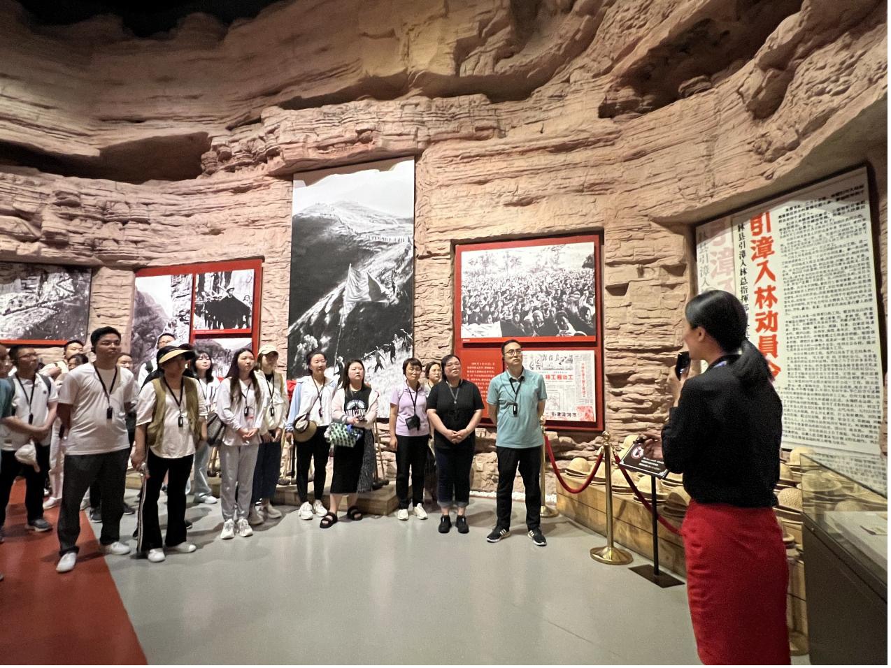 在讲解员的带领下,大家共同参观了红旗渠纪念馆。一幅幅泛黄照片,一件件陈旧工具,一个个感人故事,把大家带到水资源紧缺、旱灾不断的艰苦年代,切身感受了林县人民不认命、不服输,敢于战天斗地的英雄气概。仅靠一锤一铲两手,林县人民用血肉之躯削平了1250座山头、凿通了211个隧道、架设了151个渡槽,诠释了“自力更生、艰苦创业、团结协作、无私奉献”的红旗渠精神。